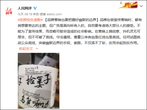 值得一提的是,在茶颜悦色道歉后,人民网网络评论部官方微博也于20日就此事发表评论。@人民网评表示,品牌在做宣传营销时,都有其想要表达的主题,但广告是面向所有人的,自然要考虑绝大部分人的感受。不能为了宣传效果,而忽略可能会造成的社会影响。