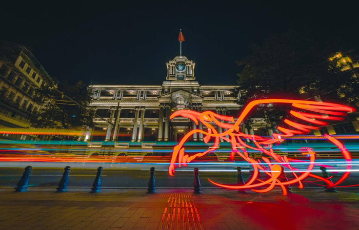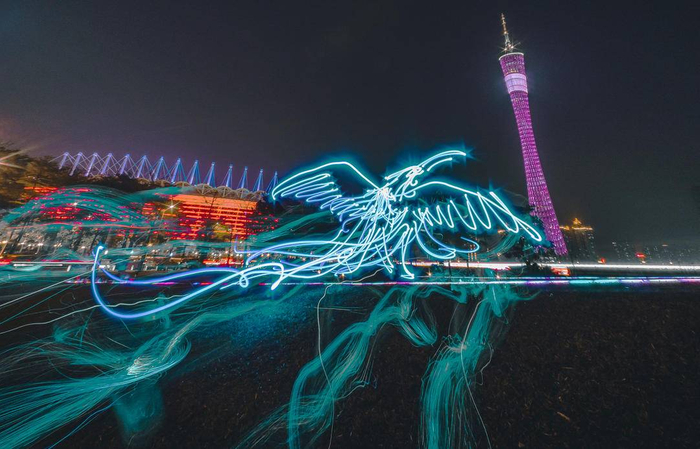 王思博总是有各种奇思妙想。一旦有了一个点子,他便开始在脑海里建模、描点,想象场景结合光效创作出来的模样。就这样,他把中国传说里的上古神兽完美地融入现代都市,夜幕下的奇特光影让画面显得意境深远,靓丽多彩。连世界最顶级的光绘艺术家Darren Pearson也评价他的《粤绘神兽》系列作品:“这是一个精彩绝妙的创意。”