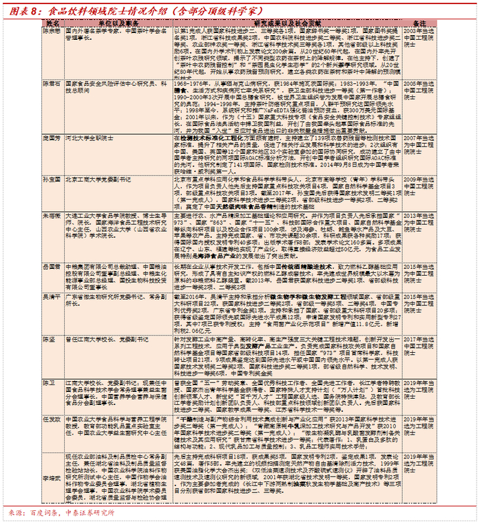 食品饮料领域院士基本情况梳理:我们系统性地梳理国内食品相关的顶级院士11人,因食品涉及到很多微生物或者基础化学相关的领域,部分院士不在统计名单中,如微生物学的邓子新院士,另外如中国农业大学的罗云波以及上海交通大学史贤明当选为国际食品科学院院士,对食品领域的贡献卓著。