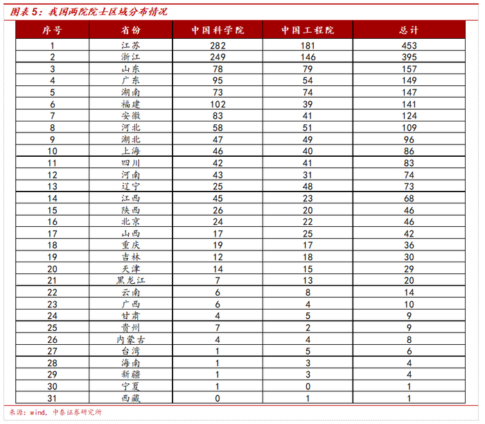 按区域分布,我国院士分布很不均衡,中西部地区提升空间大。从区域分布来看,根据微信公号“青塔”统计,从1955年中科院学部成立以来和1994年中国工程院成立以来至2017年11月,江苏籍的两院院士最多,列各省之首;浙江籍的院士共计395人,列第二。
