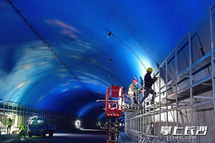 目前,麓景路南延线工程隧道顶部蓝天白云彩绘已喷涂完毕,正在进行防护板、机电安装等扫尾施工,预计今年6月实现完工。均为长沙晚报记者 王志伟 摄