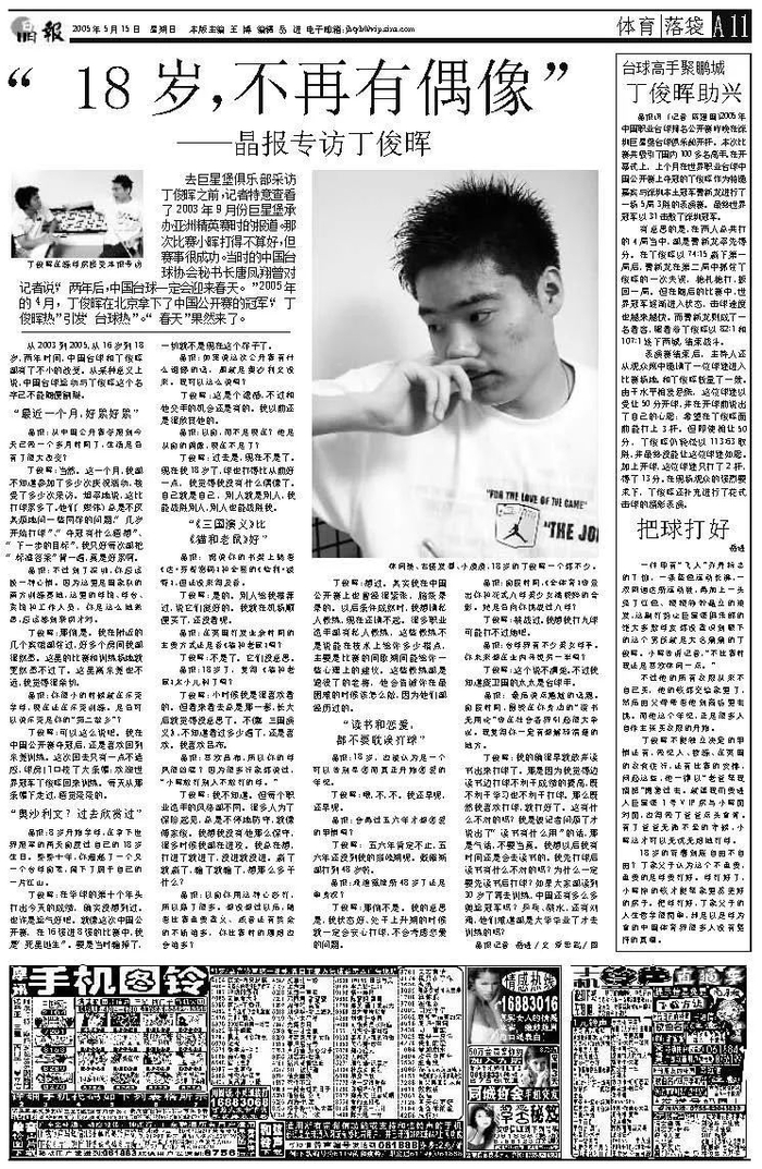 那次夺冠还彻底引发了中国的“台球热”“丁俊晖热”。紧贴当年的这个热点,2005年5月14日,晶报记者在深圳巨星堡台球俱乐部对丁俊晖做了独家专访。这家俱乐部是中国台球队的南方训练基地,也是少年丁俊晖经常训练的地方。