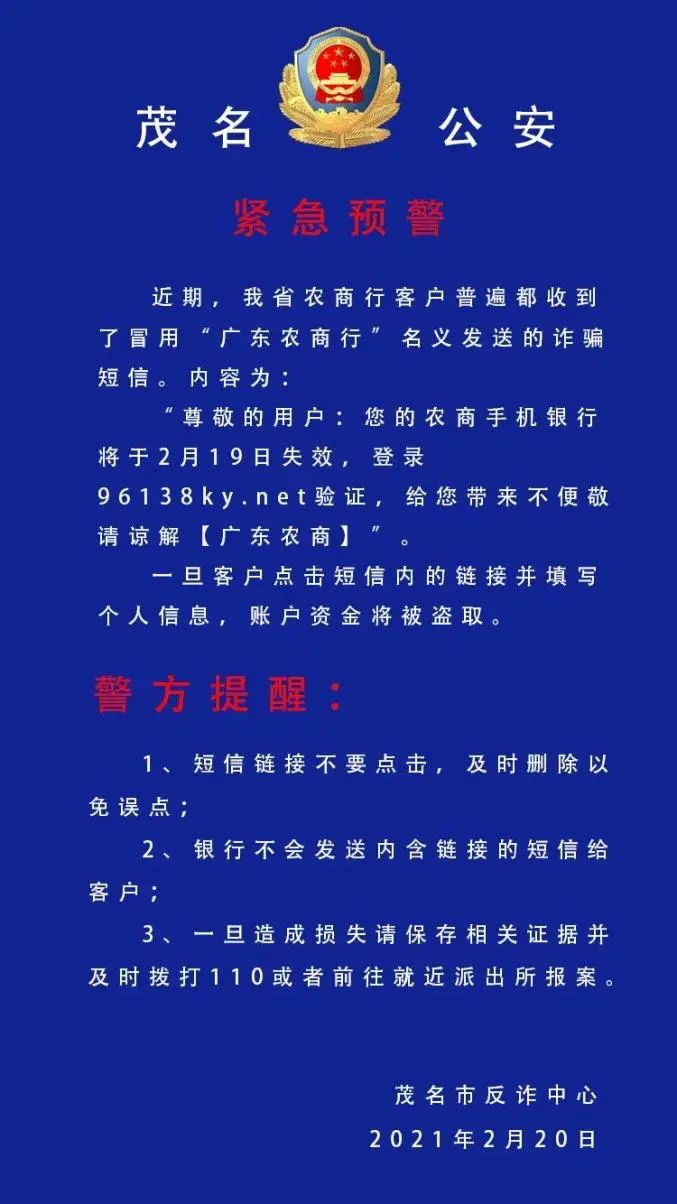 2月19日,云浮市的伍某某报警称:上午其手机收到一条短信,内容显示其手机银行将于2月19日失效,要求其登录96138kt.net验证,伍某某点开链接按照提示输入了自己的银行卡账号与密码,收到验证码继续输入,就收到广东农信公众号发来转出5000元的交易提醒信息,遂报警求助。