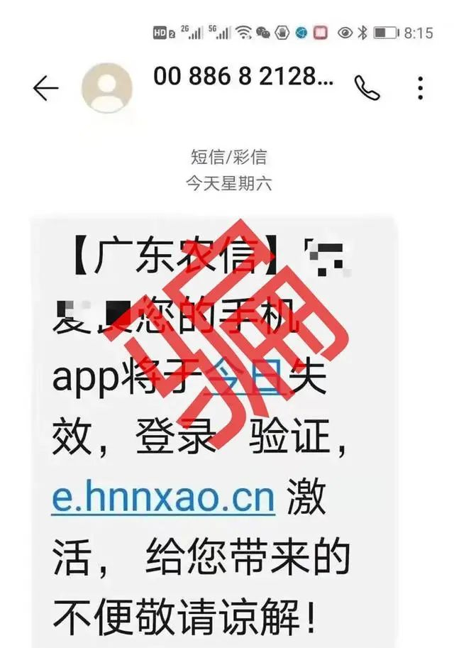 2月20日,云浮市的陈某某夫妇报警称:当天陈某某收到一条短信(你的手机APP即将失效,要登录e.hnnxao.cn的链接验证),收到短信后,陈某某毫不怀疑地按所收到的短信并按步骤操作,最后收到短信提示转出50000元后才醒悟过来知道被骗了,由于短信验证转账设了50000元限额,否则剩下的余额肯定会全部被骗走。