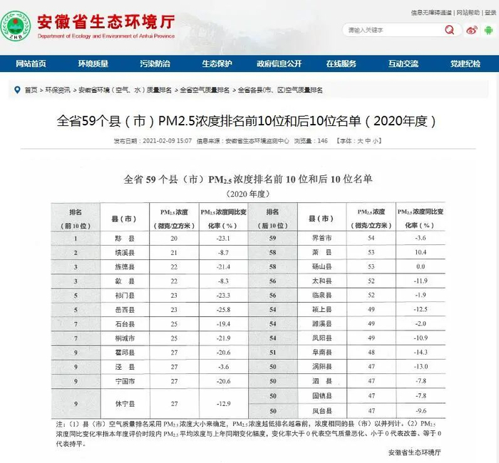 安徽县级空气质量排名出炉!
