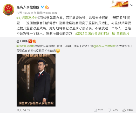@最高人民检察院 联合微博开展2021全国两会特别策划#对话最高检#,在线普法!全国检察微博矩阵“普法官”共同上阵,神秘明星、大V带头参与问答互动,一起get√新的知识点,为检察工作打call,为建设法治社会助力!