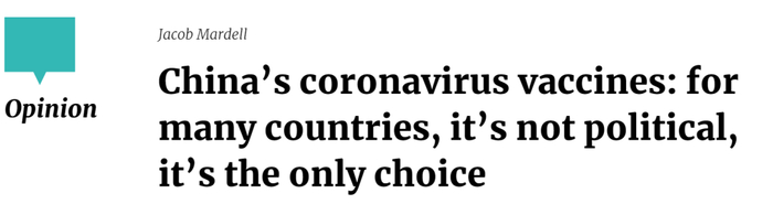 20日上午,香港《南华早报》网站刊出《中国疫苗:对许多国家来说,无关政治,而是唯一的选择》一文;