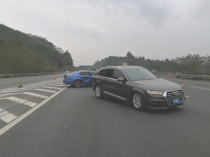 当天下午14时左右,广西公安厅交警总队高速公路管理支队七大队执勤民警接警后,立即赶到现场,看到两车正停在钦崇高速路口的分流带位置。由于撞击猛烈,桂N牌照小车车身180度旋转停在路面上,右侧车身凹陷,而与其发生碰撞的奥迪车仅车头受损。所幸,事故未造成人员受伤。