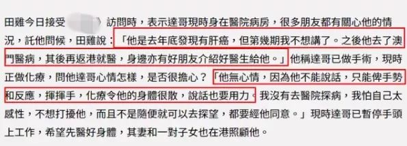 前一段时间,达叔刚录制了浙江卫视的《王牌对王牌》,他说前阵子心脏出了很大很大的问题,心脏被病毒感染,很多事情想做却力不从心,好几年没拍戏。“夜阑人静的时候,就感觉自己要走了。”他还回应还有没有机会和周星驰合作:“我还没死,他还没退休,一定有机会的。”