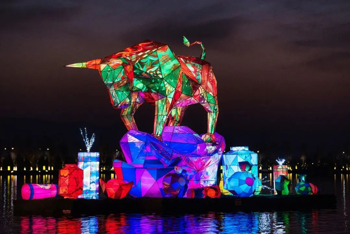 大唐不夜城用创新型材料、立体几何切面拼贴设计的酷炫公牛,通过机械传动,通过360°转动的形式向现场的市民大众送上新春的祝福,同时十四运吉祥物-秦岭四宝,置身于流光溢彩的斑驳光影中,昂首将春节的福瑞和吉祥传达给西安乃至全国。