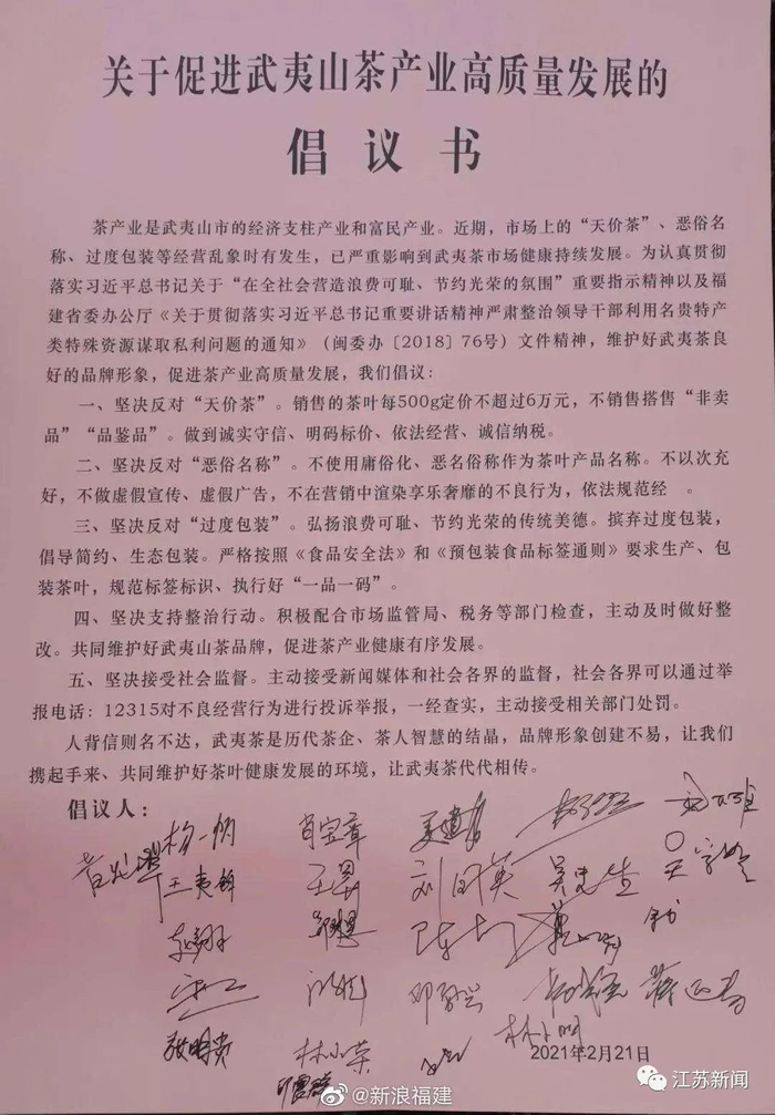 21日下午,26家曾出现在网传“天价茶”榜单上的武夷山茶企负责人共同签署《关于促进武夷山茶产业高质量发展的倡议书》,自觉接受监督。