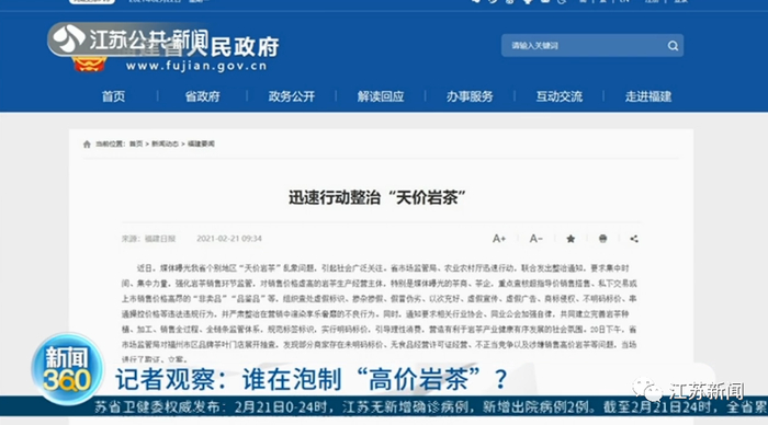 最新消息显示,针对当地"天价岩茶"乱象,福建省市场监管局和农业农村厅联合发出整治通知,要求强化岩茶销售环节监管;并组织查处虚假标识、掺杂掺假、虚假宣传、不明码标价、串通操控价格等违法违规行为。