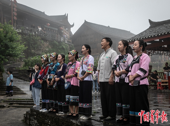 2020年6月11日,湖南省湘西土家族苗族自治州花垣县十八洞村,村民唱起山歌送别游客。2013年11月3日,习近平总书记在十八洞村首次提出“精准扶贫”。2016年,全村136户533名贫困人口全部实现脱贫,该村退出贫困村行列。中青报·中青网记者 李峥苨/摄