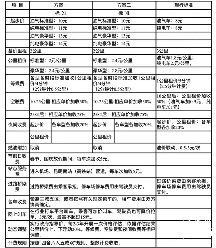 听证会上,来自政府部门、社会组织人员和群众代表的听证参加人均表示认可方案一的征求意见稿,主要内容是将昆明市区巡游出租汽车的基价里程由现行的3公里调整为2公里;起步价除了按标准、豪华车型划分外,还按汽(柴)油车、油气车、纯电动汽车进行细分。标准型汽(柴)油车、油气车起步价为10元,标准型纯电动汽车11元。豪华型汽(柴)油车、油气车为13元,豪华型纯电动汽车14元。车公里租价按标准、豪华车型划分调整为2元/公里及2.4元/公里。