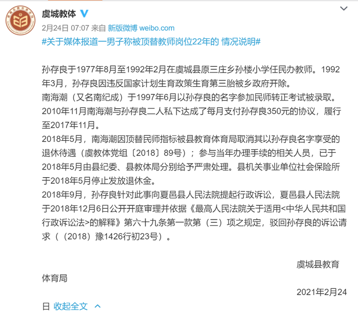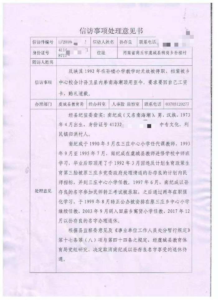 孙存良又走上了维权之路。孙艳收说,最终在2019年得到答复。河南省虞城县教育体育局官方微博24日对外发布内容:顶替者被取消了退休待遇;参与当年办理手续的相关人员,已于2018年5月由县纪委、县教体局分别给予严肃处理。