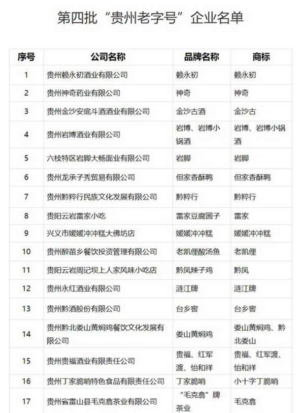 据贵州省商务厅网站获悉,为弘扬贵州优秀传统文化,促进“贵州老字号”传承发展,提升品牌价值和影响力,壮大“贵州老字号”企业队伍,经企业申报、各市(州)商务局推荐、第三方机构评审和面向社会公示等程序,经省商务厅研究,决定认定贵州赖永初酒业有限公司(赖永初)等33家企业(品牌)为第四批“贵州老字号”。具体如下: