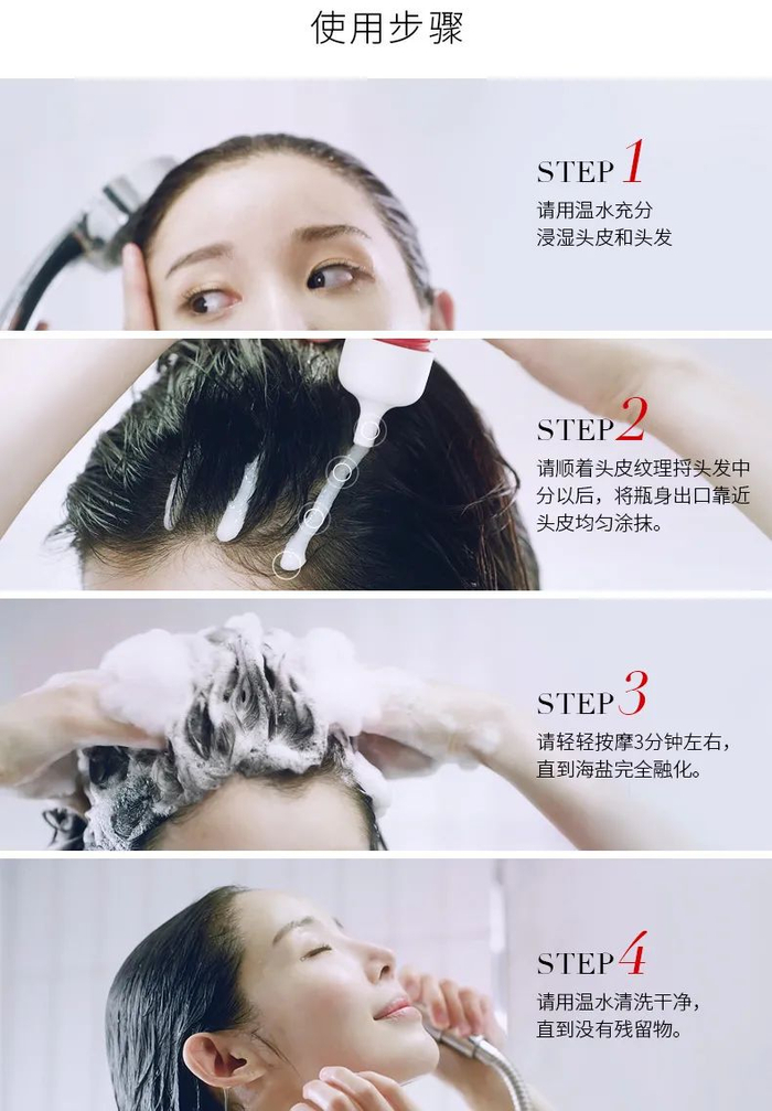 添加墨西哥湾海盐,摸得到的海盐颗粒,代替手指帮你清扫头皮上的顽固油脂、皮屑和发胶,给你的头皮做个深度的清洁马杀鸡。
