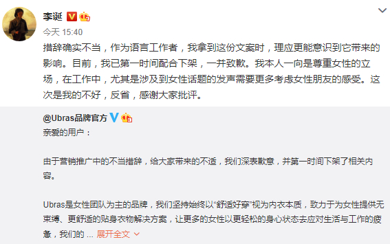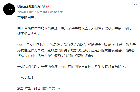 当晚(24日),Ubras品牌在其官博发布致歉声明,称“由于营销推广中的不当措辞,给大家带来的不适,我们深表歉意,并第一时间下架了相关内容。”并表示,其是女性团队为主的品牌,“致力于为女性提供无束缚、更舒适的贴身衣物解决方案,让更多的女性以轻松的身心状态去应对生活与工作的疲惫。”