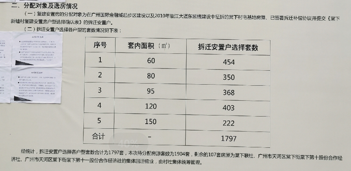 复建安置区共建设住宅套数1916套,除有12套属于超计容面积,不在可供分配的房源范围内,待分配房源共1904套。其中拆迁安置户选择各户型套数为1797套,剩余107套为棠下联社、棠下第十股份合作经济社、棠下第十一股份合作经济社的集体回迁物业。