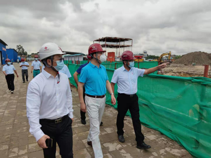 日前,驻刚果(金)大使朱京来到中国政府援建的金沙萨中部非洲文化艺术中心工地,看望慰问节日期间坚守岗位、坚持施工的中方员工,并检查疫情防控工作。使馆经商参赞徐元杰陪同。