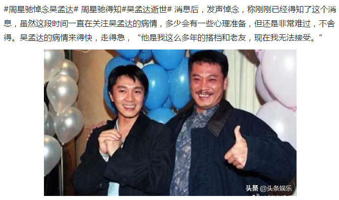 得知吴孟达逝世的消息后,周星驰发声悼念,称刚刚已经得知了这个消息,虽然这段时间一直在关注吴孟达的病情,多少会有一些心理准备,但还是非常难过,不舍得。吴孟达的病情来得快,走得急,“他是我这么多年的搭档和老友,现在我无法接受。”