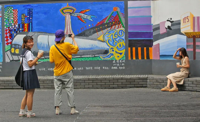 青绿色的老式内燃机火车头搭配红砖灰瓦的老式车间,5层楼高的卡通熊猫巨幅画像立于街角,整洁的街道两旁装饰着各类新潮艺术“涂鸦”,不少“网红”小景点引游人驻足拍照……这便是“重生”后的成都市成华区二仙桥街道下涧槽社区。