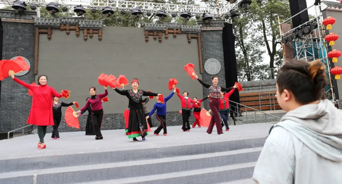 在成都成华区二仙桥街道文化活动中心的院坝舞台上,一支老年舞团在社区艺术团老师的指导下排练扇子舞 谢秀栋 摄