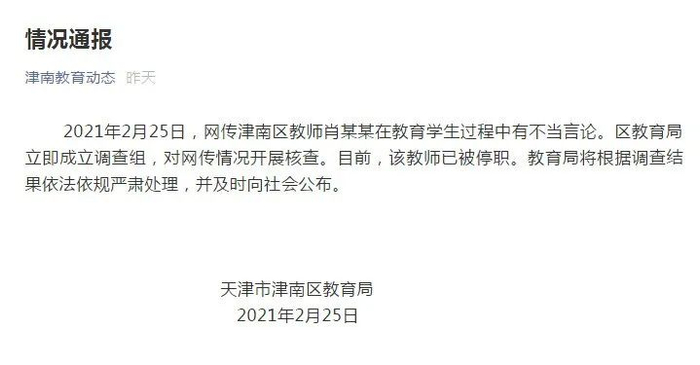 25日,津南区教育局通报称,已注意到肖某某在教育学生过程中有不当言论。“区教育局立即成立调查组,对网传情况开展核查。目前,该教师已被停职。”通报称,教育局将根据调查结果依法依规严肃处理,并及时向社会公布。