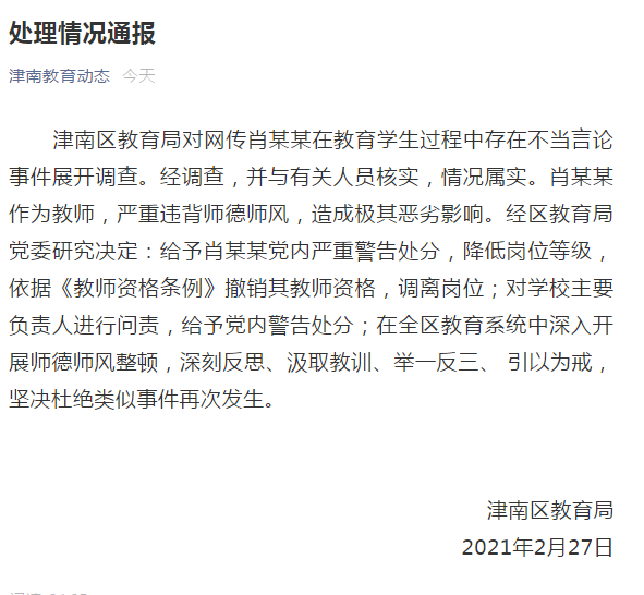 今日,津南区教育局微信公众号发布通报,津南区教育局对网传肖某某在教育学生过程中存在不当言论事件展开调查。经调查,并与有关人员核实,情况属实。经津南区教育局党委研究决定:给予肖某某党内严重警告处分,降低岗位等级,依据《教师资格条例》撤销其教师资格,调离岗位;对学校主要负责人进行问责,给予党内警告处分。