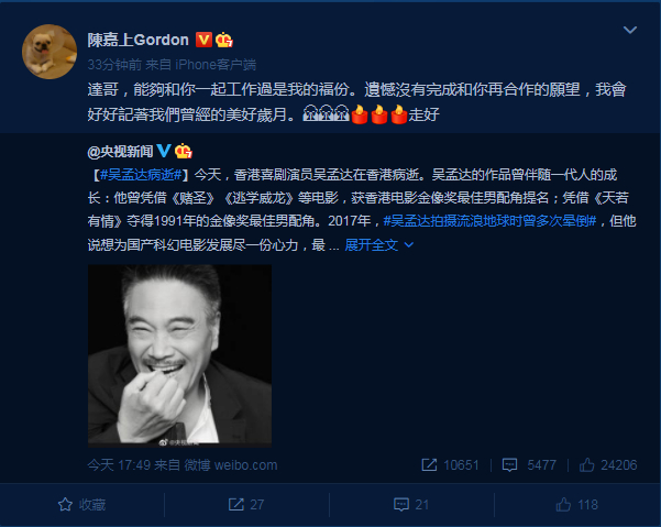 在得知吴孟达逝世的消息后