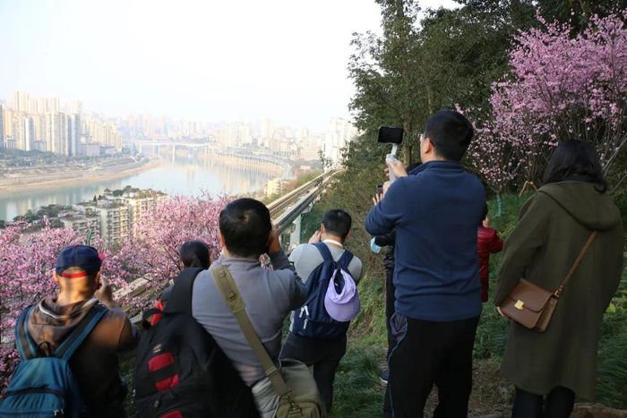 时至二月下旬,春色浸满山城重庆。在渝中区佛图关一带,逶迤连绵的梅花饱含春光,吸引着四面八方的游客前来观赏。除了拍摄美人梅之外,游客们举起手机相机,等待着每几分钟,就会开来一趟的单轨二号线列车。当通体彩色涂装的列车,穿过沿途春花烂漫,被网友称为是“开往春天的列车”。