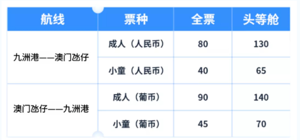 另外,航线开通初期(2021年3月1日—2021年4月30日),珠海九洲港至澳门成人/儿童票仅需38元人民币/人;澳门至珠海九洲港成人/儿童票则需48元葡币/人。