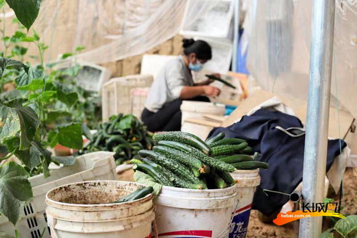 藁城区廉州镇清流村的蔬菜大棚内刚刚收获的黄瓜。