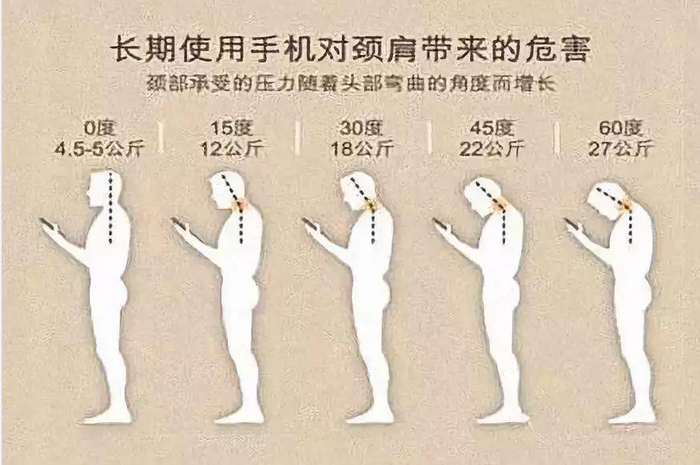 一个成年人,工作时低头30度,颈椎间盘要承受将近18公斤的压力;60度低头看手机时,颈椎间盘承担着大约27公斤——也就是一袋大米的重量。