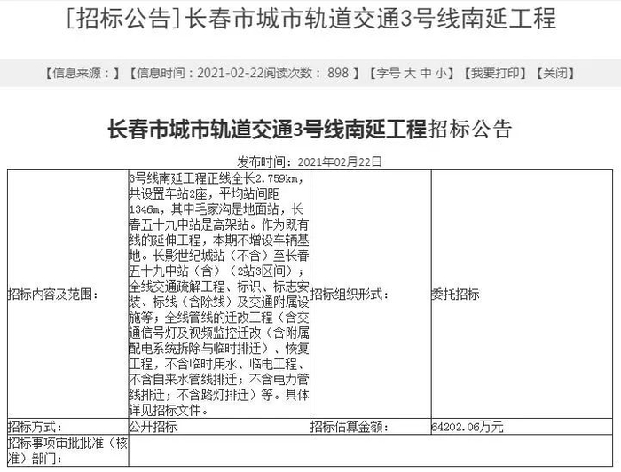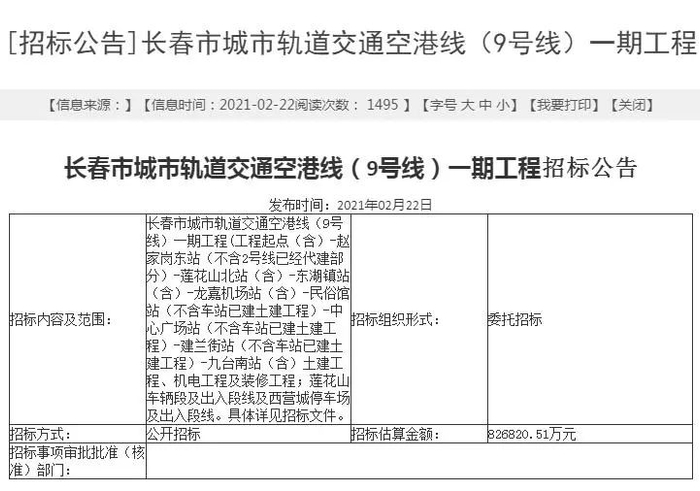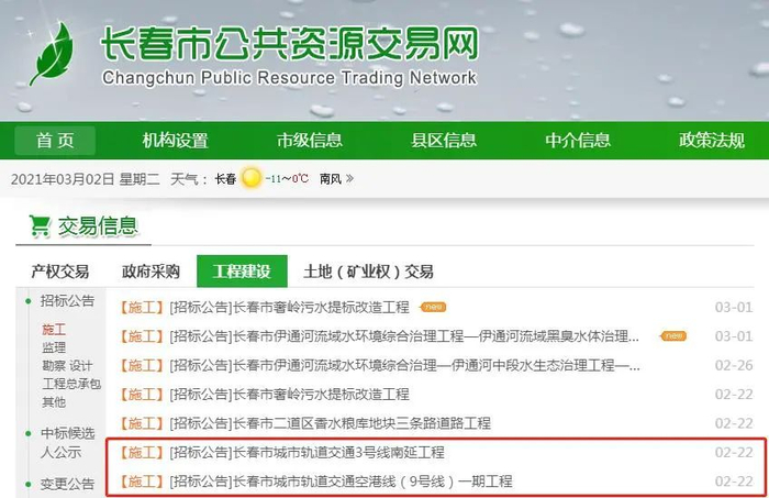 原文标题:长春市城市轨道交通空港线(9号线)一期工程招标公告 | 长春市城市轨道交通3号线南延工程招标公告