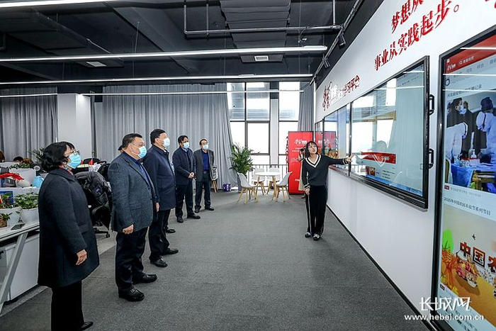 3月1日下午,李新平一行到长城新媒体集团参观调研。这是在冀云融媒体中心听取情况介绍。长城网记者 刘潇 摄