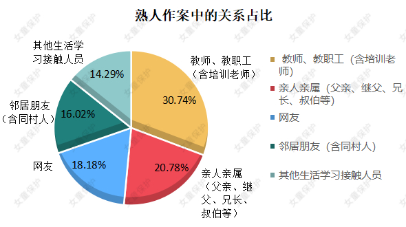 231起熟人作案的案例中,教师、教职工(含培训老师)作案71起,占比30.74%;亲人亲属(父亲、继父、兄长、叔伯等)作案48起,占比20.78%;网友作案42起,占比18.18%;邻居朋友(含同村人)作案37起,占比16.02%;其他生活学习接触人员作案33起,占比14.29%。