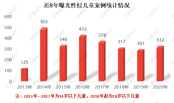 “女童保护”统计,2020年全年媒体公开报道的性侵儿童(18岁以下)案例332起,受害人数845人(未表明具体人数的案例中,“多人”按3人计,“十几人”按15人计,“几十人”“数十人”按30人计)。2013年至2019年,每年媒体公开报道的儿童被性侵的案例分别是125起、503起、340起、433起、378起、317起、301起(其中,2013年-2017年统计案例为14岁以下儿童,2018年起为18岁以下儿童)。
