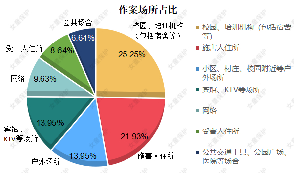 “女童保护”统计,在332起媒体报道的案例中,表明性侵发生场所的有301起,其中发生在校园、培训机构(包括宿舍等)的有76起,占比25.25%;在施害人住所的有66起,占比21.93%;在小区、村庄、校园附近等户外场所的有42起,占比13.95%;在宾馆、KTV等场所发生的也是42起,占比13.95%;通过网络发生的29起,占比9.63%;在受害人住所的26起,占比8.64%;在公共交通工具、公园广场、医院等场合的有20起,占比6.64%。