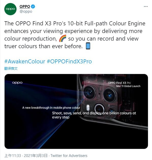 OPPO宣布,OPPO Find X3系列首发安卓10bit全链路色彩管理系统。