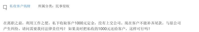 在离职之前,我利用工作之便,私下收取客户1000元定金,没有上交公司。现在客户不能补齐尾款,与原公司产生纠纷。请问我需要负法律责任吗?如果及时把私收的1000元还给客户,这样可行吗?