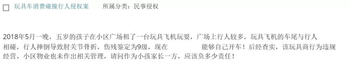 第二,若你的孩子在无家长陪同下独自租玩具玩耍,导致行人受伤,则你作为法定监护人,亦未尽到监护职责,应承担主要赔偿责任。当然,玩具商向没有家长陪同的5岁孩子出租玩具,显然也未尽到审慎义务,与结果的发生有着间接因果关系,故也应承担一定的责任。关于物业,若物业公司与你所在小区业主委员会签订物业服务合同,物业公司对商贩在小区的经营行为有管理职责,那么,其允许玩具商在小区违规经营,与结果的发生也存在间接因果关系,因此也应承担一定的责任。