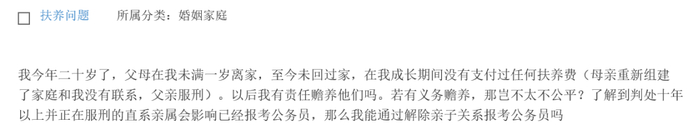 我今年二十岁了,父母在我未满一岁离家,至今未回过家,在我成长期间没有支付过任何抚养费(母亲重新组建了家庭和我没有联系,父亲服刑)。以后我有责任赡养他们吗?了解到判处十年以上并正在服刑的直系亲属会影响报考公务员,我能通过解除亲子关系报考公务员吗?