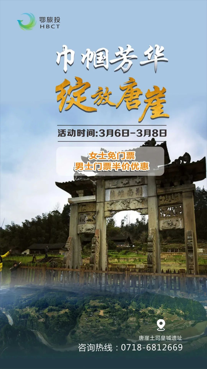 在唐崖土司城址景区,3月6日至3月8日,女性可享受免门票优惠,同行男士可享半价优惠。