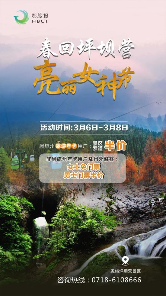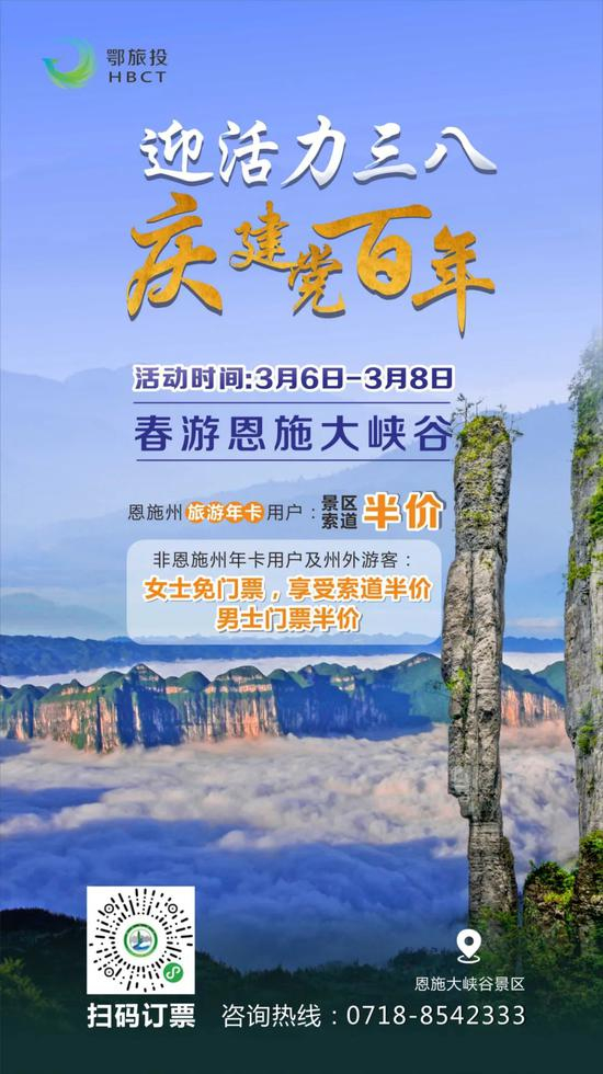 在恩施大峡谷景区,3月6日至3月8日,凭恩施州旅游年卡可享受景区索道半价,非恩施州年卡用户及州外游客,女士免门票,享受索道半价,男士门票半价。