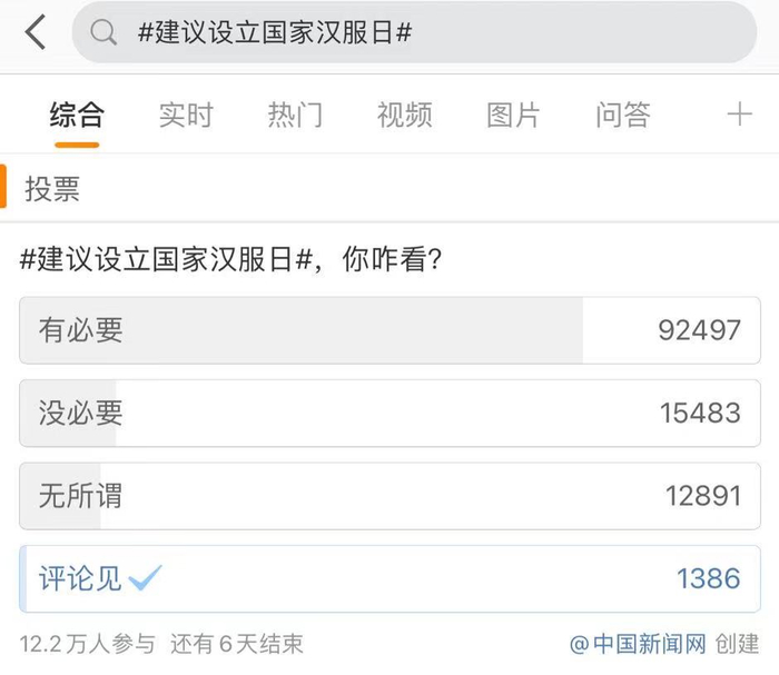 对于这个建议,众多网友点赞!在超12万名网友参与的投票中,有超过9万人选择“有必要”设立国家汉服日。
