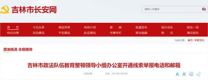 为进一步畅通涉吉林市政法队伍问题线索举报渠道,方便群众反映问题,现向社会公布吉林市政法队伍教育整顿线索举报电话和邮箱。