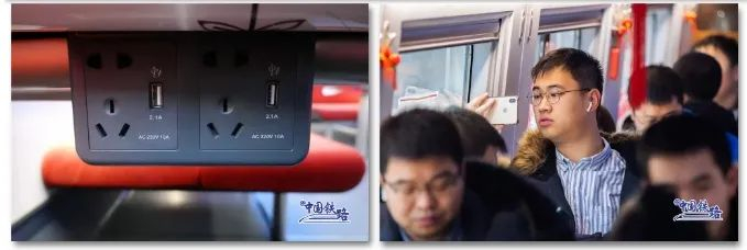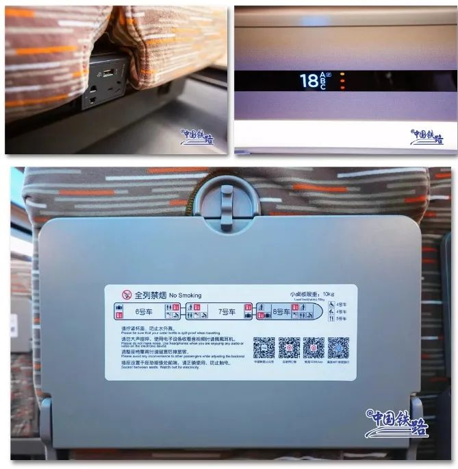 座椅设有靠背调节按钮,旅客可以利用扶手上的调节按钮调整靠背角度;座椅下方的充电口设有两孔、三孔插座和USB接口。