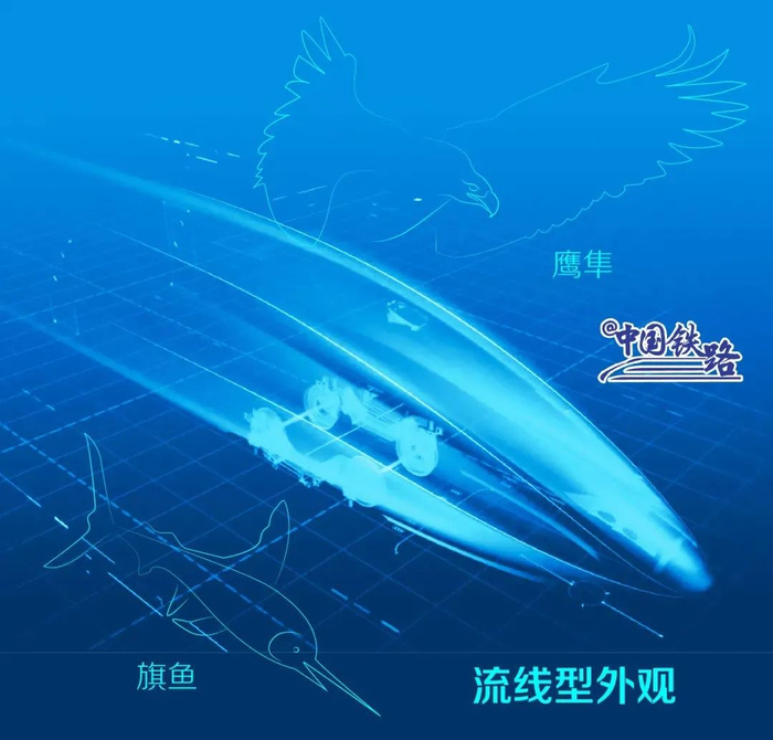 尖尖的车头“模仿”大自然中的鹰隼和旗鱼,外形更加突出流线型设计,对于车厢连接处、车顶上的受电弓也充分考虑空气阻力影响,使其更加平顺。