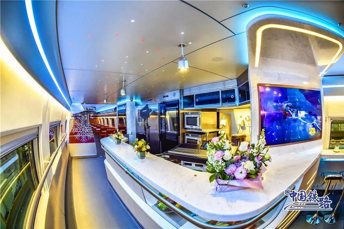 餐吧吧台采用开放式设计,车厢视觉通透,没有遮挡。